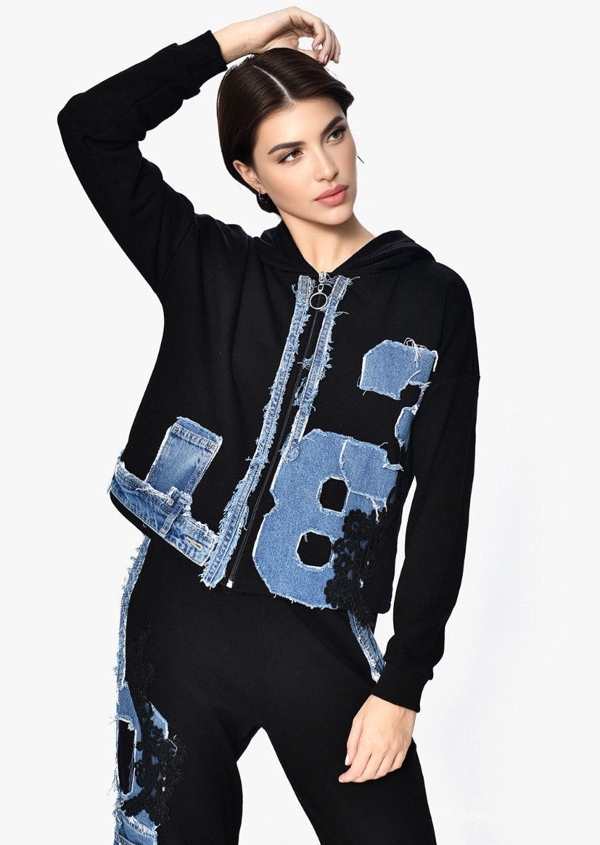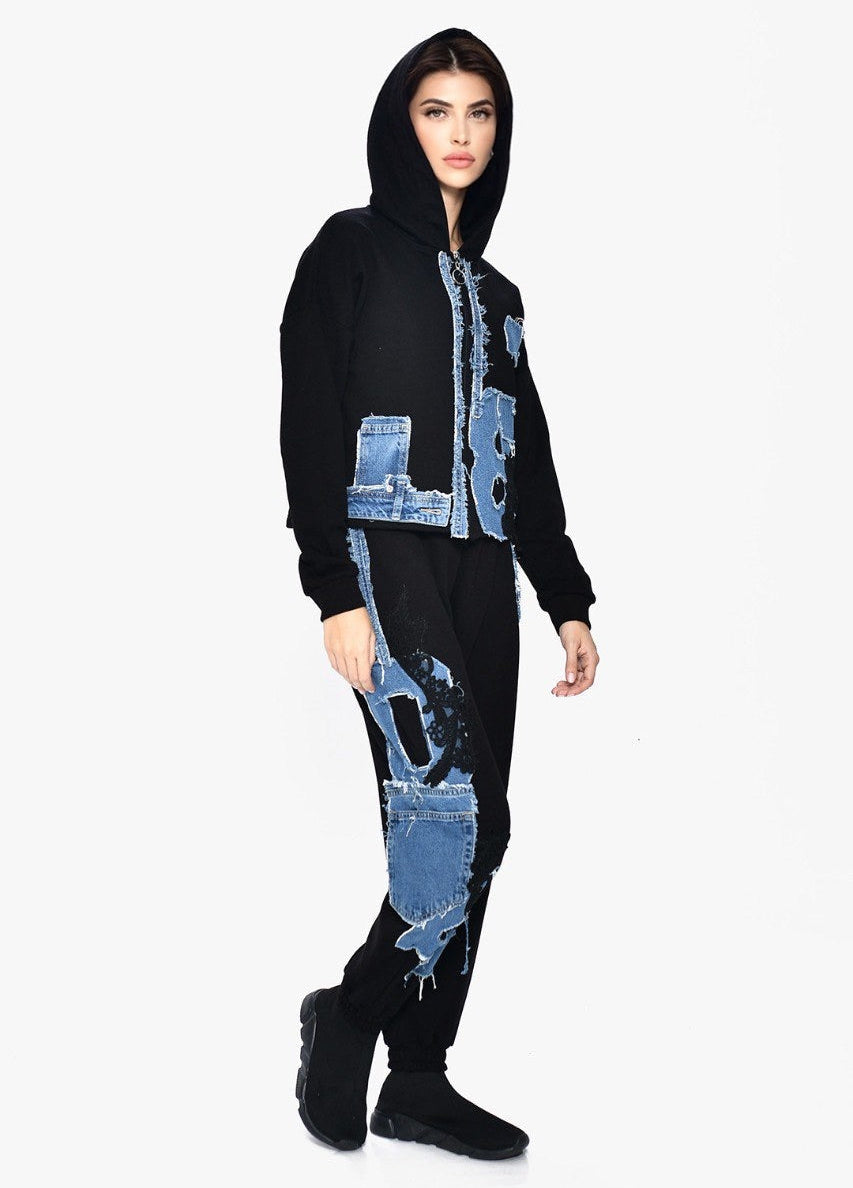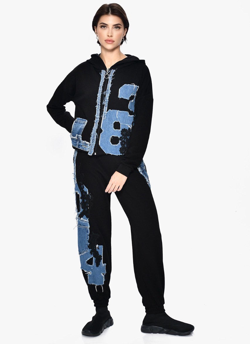 This two-piece set features a warm fabric decorated with denim panels and lace details for a unique, textured look. The top has a relaxed, straight cut, and the matching pants offer an easy, comfortable fit. Soft, cozy, and stylish — a perfect everyday set with elevated detailing.